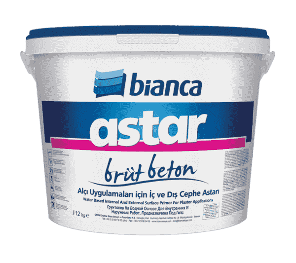 Uygulama Bianca Brüt Beton Astarı uygulaması yapılacak yüzeyler; her türlü kir, yağ ve tozdan arındırılmış temiz ve kuru olmalıdır. Bianca Brüt Beton Astarı tek kat olarak rulo ile uygulanır. Bianca Brüt Beton Astarı uygulandıktan 6 saat sonra alçı uygulamasına geçilir. Uygulama esnasında yüzey ve ortam sıcaklığının en az +5°C en çok +30°C arasında olmasına dikkat edilmelidir. Bianca Brüt Beton Astarı uygulamasından sonra en geç 7 gün içinde mutlaka sıva, alçı uygulamasına geçilmelidir.